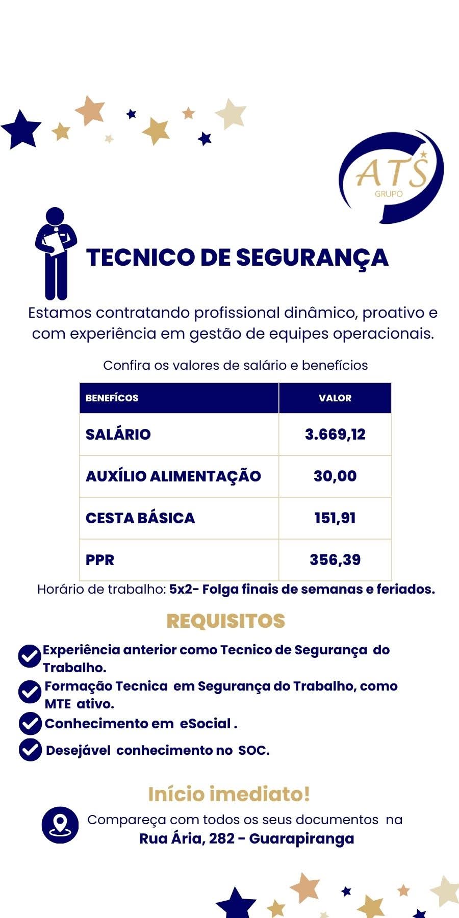 Oportunidade de Emprego! Estamos contratando Técnico de Segurança para atuar na região de: Zona Sul- Guarapiranga. Benefícios: Salário: R$ 3.669,12 Auxílio Alimentação: R$ 30,00Cesta Básica:R$ 151,91PPR: R$ 356,39Escala: 5×2.Folga finais de semana e feriados REQUISITOS; Experiência anterior como Técnico de Segurança do Trabalho. Formação Tecnica em Segurança do Trabalho, como […]