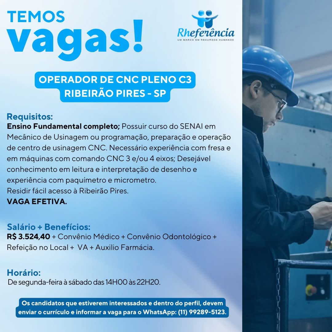 Vaga de operador de CNC Pleno C3 com Salário inicial de R$ 3.524,40 + Benefícios
