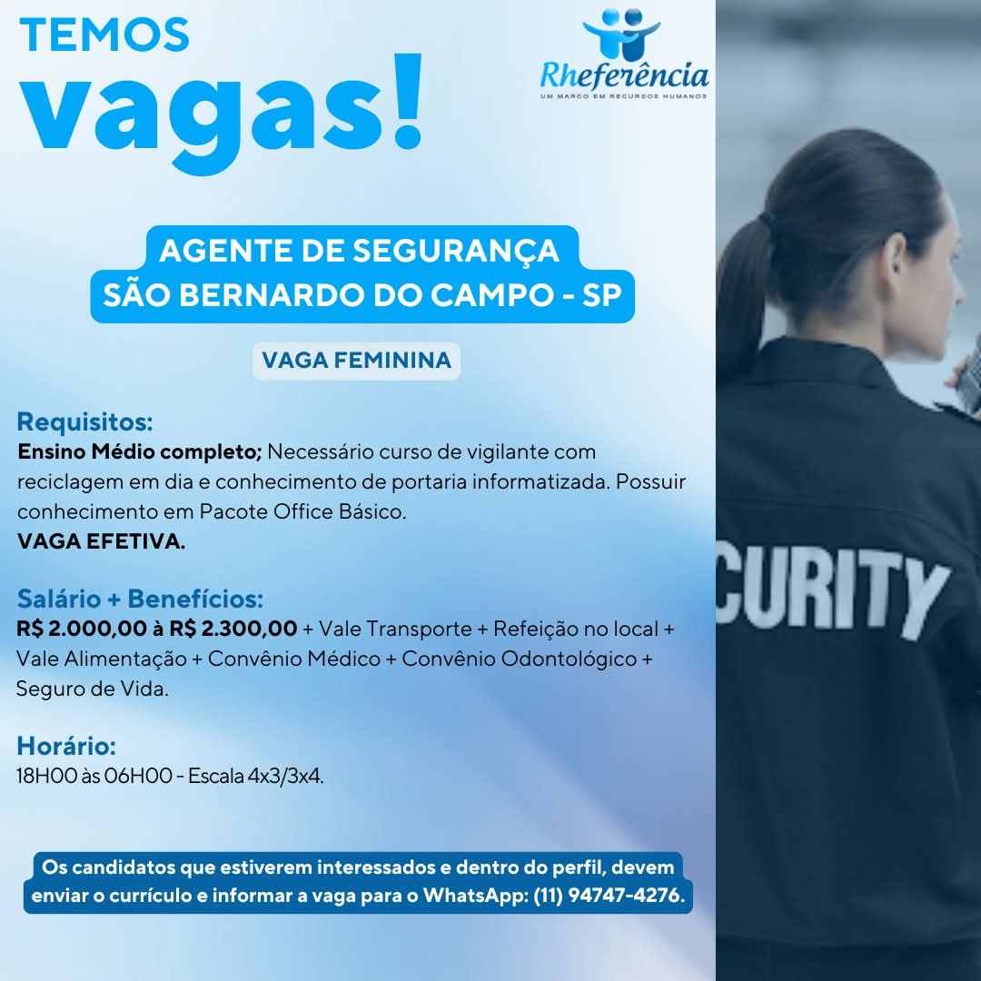 Vaga de Agente de Segurança com Salário de até R$ 2.300,00 + Benefícios