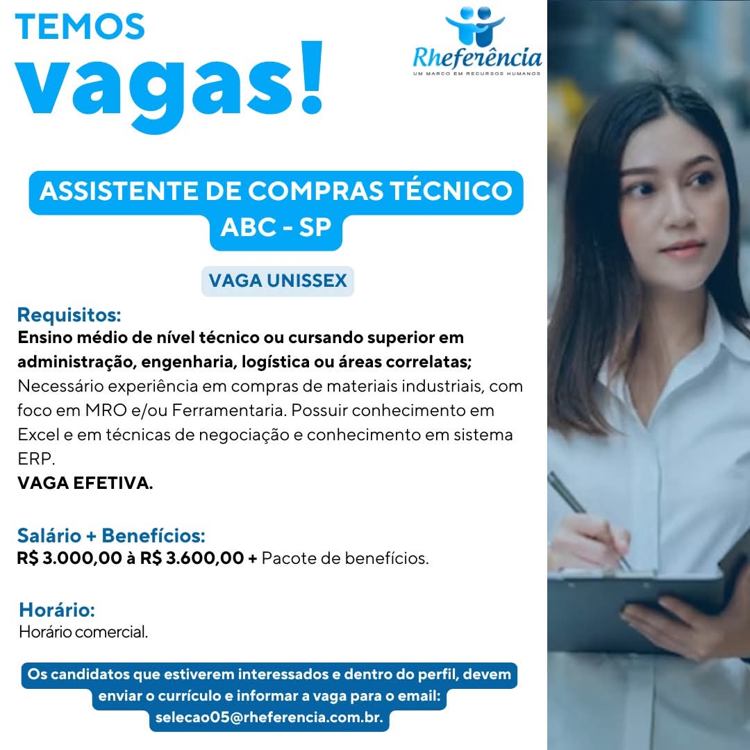 Vaga de Assistente de compras técnico para região do ABC com salário de R$ 3.400,00 + Pacote de benefícios