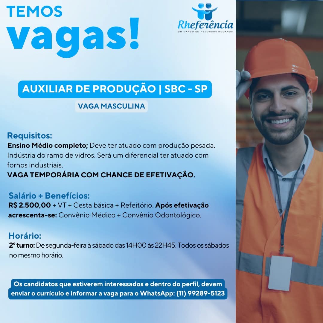 Vaga de auxiliar de produção com Salário de R$ 2.500,00 + benefícios