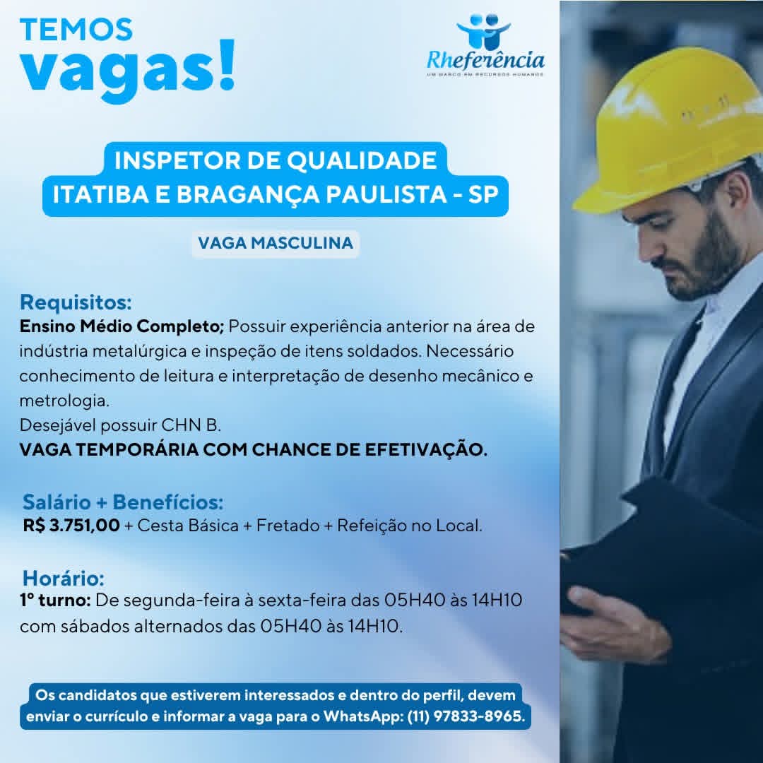 Vaga de inspetor de qualidade com Salário de R$ 3.751,00 + Benefícios