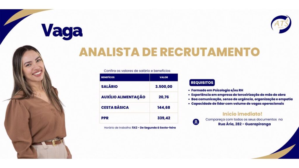 Compareça presencialmente com seus documentos pessoais, carteira de trabalho, currículo atualizado e certificados.