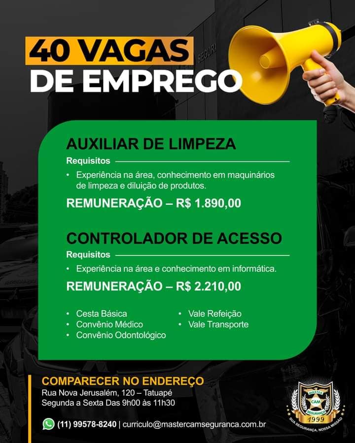 Observação: O Hoje Empregos atua apenas como um intermediário entre empresas e candidatos, não participando do processo seletivo e não cobrando qualquer taxa de nenhum candidato. Fique atento(a) a possíveis tentativas de golpes: NUNCA PAGUE ou forneça dados pessoais para obtenção de um CURSO, EMPREGO ou ENTREVISTA. O Grupo MasterCam […]