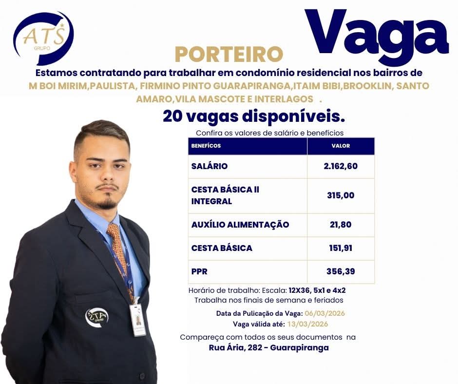 Hoje Emprego março 6, 2026 março 6, 2026 Deixe um comentário Serviços Oportunidade de Emprego – Porteiro Oportunidade de Emprego - Porteiro Região: Guarapiranga, M Boi Mirim, Paulista, Interlagos,.... Leia Mais