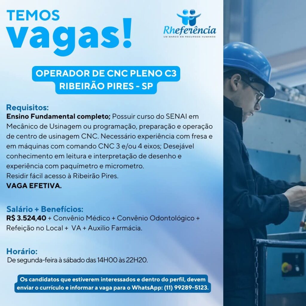 VAGA DE OPERADOR DE CNC PLENO C3 NA REGIÃO DE RIBEIRÃO PIRES – SP